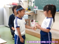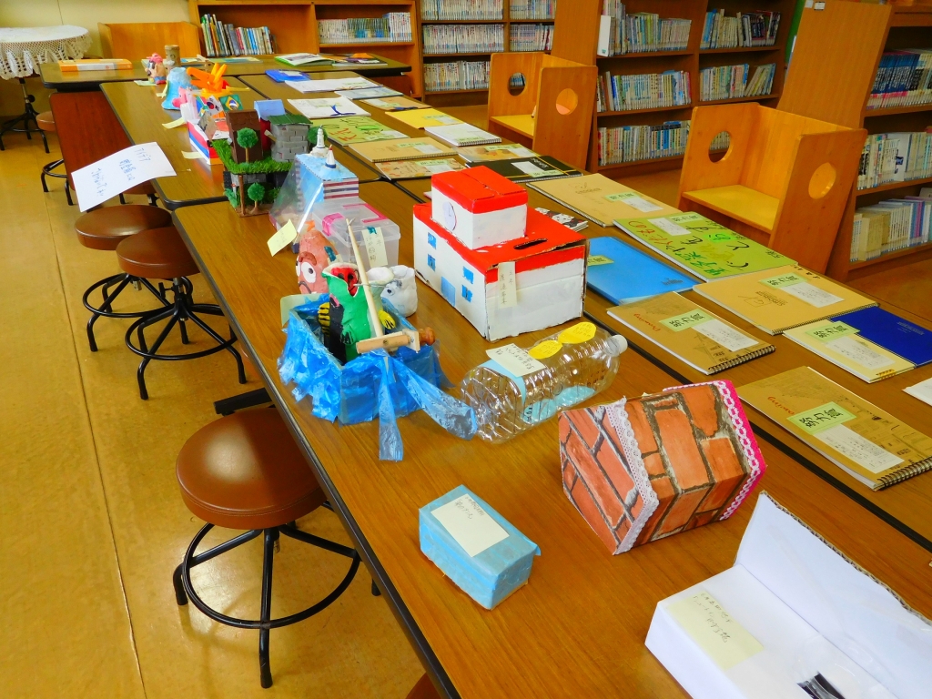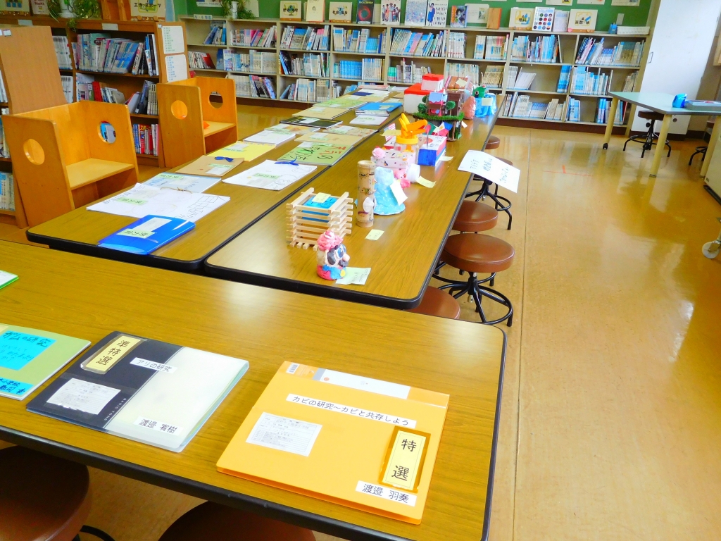 今、2階の図書室に夏休みの力作が展示されています。本年度も保護者の皆様のアドバイスやご協力により、多数の作品(理科自由研究、アイディア貯金箱、工作、ポスター等)が出品されました。特に、理科自由研究には、理科離れが進んでいると言われている中、33名の子どもたちが作品を提出しました。今後も自然に対する、興味・関心をもち続け、根気強く継続して観察したり、実験したりする力を養っていって欲しいと思います。