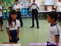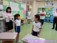 1年生の学級活動の時間を先生方で参観しました。「あいさつのしかたはだいじょうぶかな」という題材で,あいさつのよさについての学習です。1年生は4名と少ないのですが,一人一人が自分の意見をはっきり述べ,充実した学習を展開していました。あいさつの練習をする中で,「あいさつすると気持ちがいいね。」「元気にあいさつしてもらうとうれしいね。」とこれからも実践しようという意欲が高まりました。