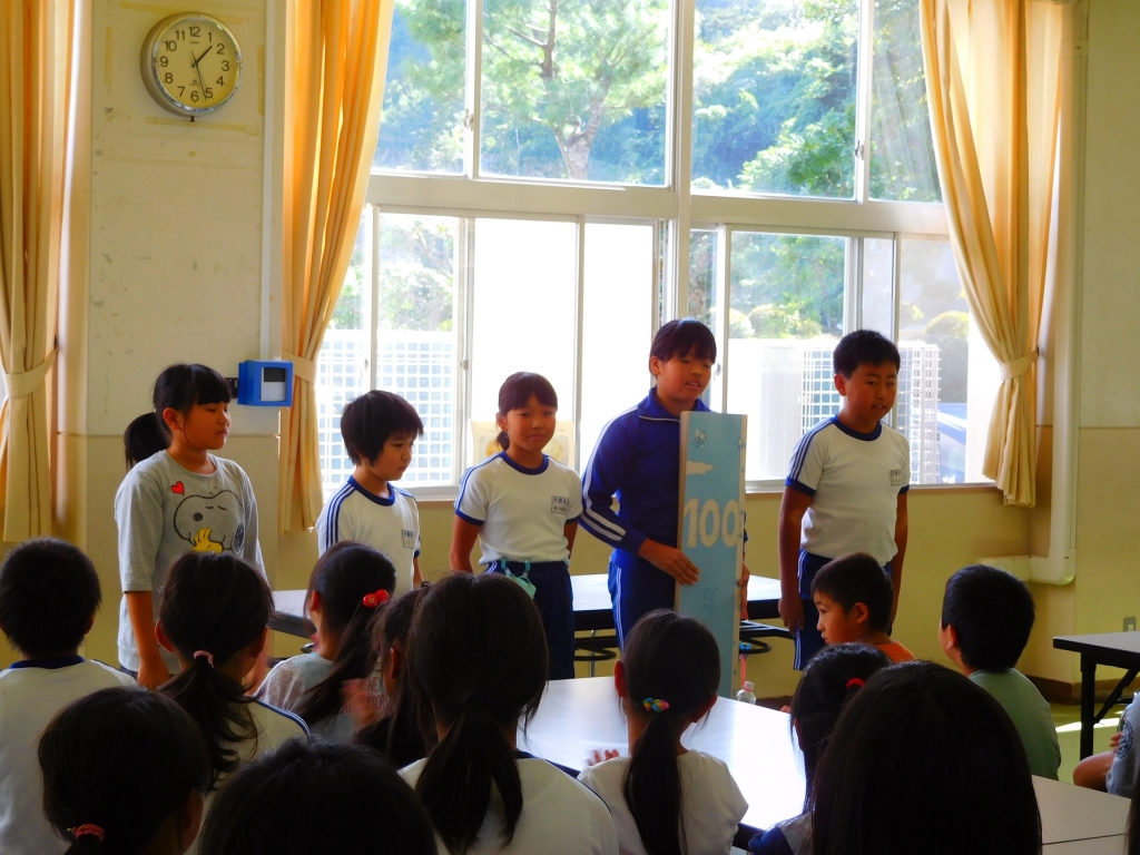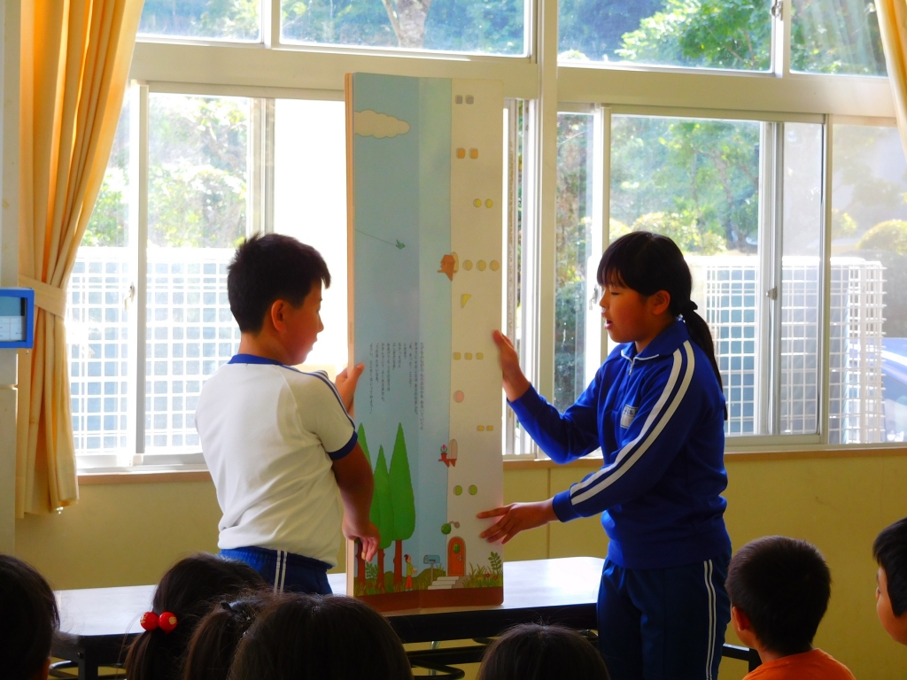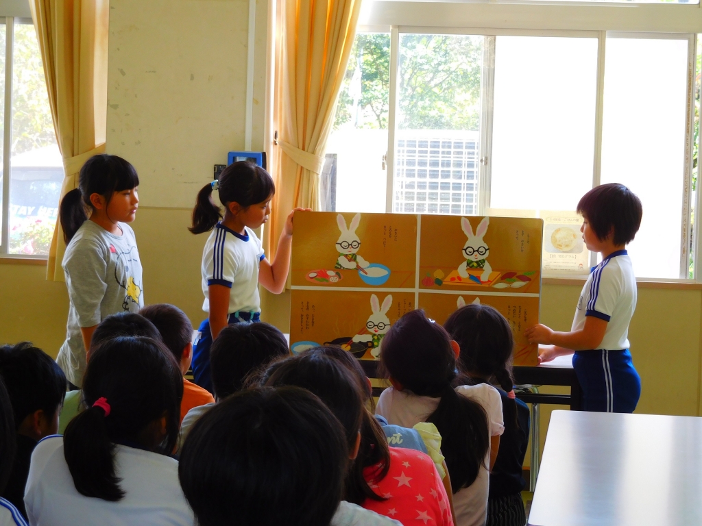 昼休みに、図書委員会の児童による読み聞かせがありました。図書委員の児童は、何日も前から、よく聞いてもらえるように、声の大きさや速さなどを意識して練習に取り組んできました。大判の図書を扱うのは難しいですが、練習の成果を生かし上手に読み聞かせを行うことができました。