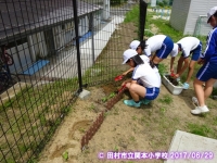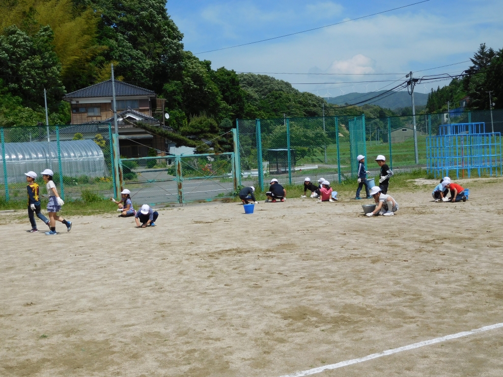 22日の昼休み後に、上学年が委員会活動をしている間に下学年の子どもたちが、ボランティアで草むしりを行いました。それぞれの学年で軍手とバケツを準備し、下校庭に向かっていきました。早速割り当ての場所の草むしりに取りかかりました。前日に雨が降ったので、かなりむしりやすくなっていました。子どもたちなりに一生懸命取り組み、あっという間にバケツがいっぱいになりました。自分の学校のことを考え、できることを主体的に行動する子どもたちです。