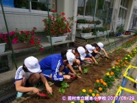 今年度は,地球温暖化防止に向けて緑のカーテンを作る活動に取り組むことになりました。図書ホールの前に,網を張り,緑のカーテンを作ります。環境委員会の児童が,アサガオの苗植えを行いました。どんなカーテンができるかとても楽しみです。余った苗は,フェンスのところに植えました。