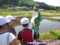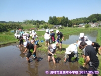 5年生では,総合の時間に稲を育てる活動を始めました。今日は,地域の方にお世話になり,田植えをしました。田に入ったとたん転んだ児童もいて,どろんこになりながら,田植えをしました。