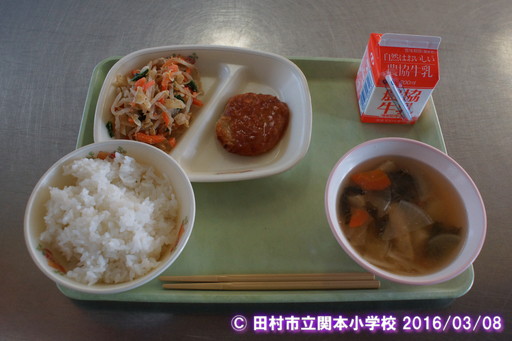 給食のメニューは、ご飯と、鶏つくねえごま和え、里芋の味噌汁、牛乳でした。このうち、鶏つくねやごま和えは、安全を確認した地場産物を使用しています。また、ご飯も田村産のお米を使用しています。