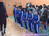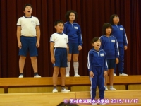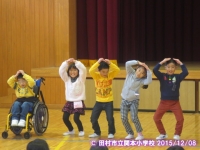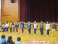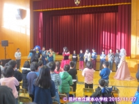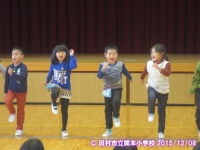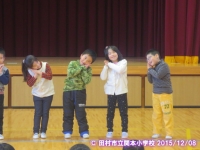 12月8日(火)の発表集会、いよいよ1年生の発表です。これまで6年生から2年生までの発表を見てきて、今回1年生初めての発表集会でした。とはいえ、学習発表会を経験しているので、堂々として、見ているみんなを楽しませようとする気持ちも感じられました。