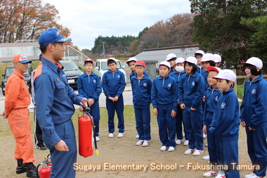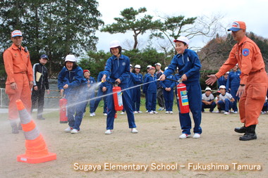 全体会のあとは、消火器を使った訓練を6年生全員が体験します。