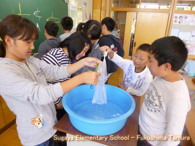 全校集会で校長が演示した「水を満たしたポリ袋に鉛筆を刺す実験」から、子どもたちは、なぜ水が漏れないかを一生懸命考えています。