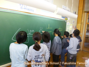 6年生は、みんなで鉛筆を刺して考えます。一人が黒板に書き始めたらみんな理由を書き始めました。