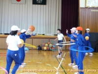 前回に引き続き、右手と左手を逆回しにする動きをしたり、ボールやフラフープを使って運動したりしました。どれも見ていると簡単そうなのですが、いざやってみると、思うようにいきません。それでも、くり返し練習しできたときの笑顔は素敵でした。