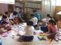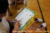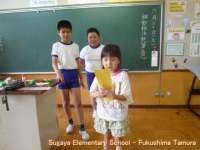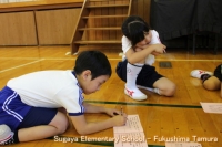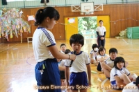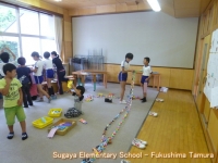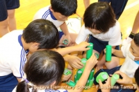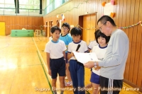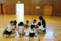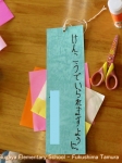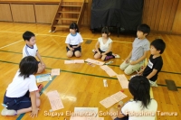 縦割り班ごとに紙飛行機を飛ばして、一番遠くまで飛んだ人が発表します。