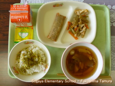 本日の給食は、ごはんにやさいふりかけ、春巻き、筑前煮、ふき炒め、牛乳です。筑前煮は、小さい子のために具が小さく切ってありますが、だしもよくきいて、美味しくいただきました。子どもたちも、たくさん食べてくれると思います。