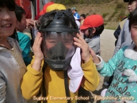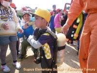 消防車の装備などを説明していただき、実際に出動時に使っている服や酸素ボンベを身につけさせていただきました。みんな、大喜び!!