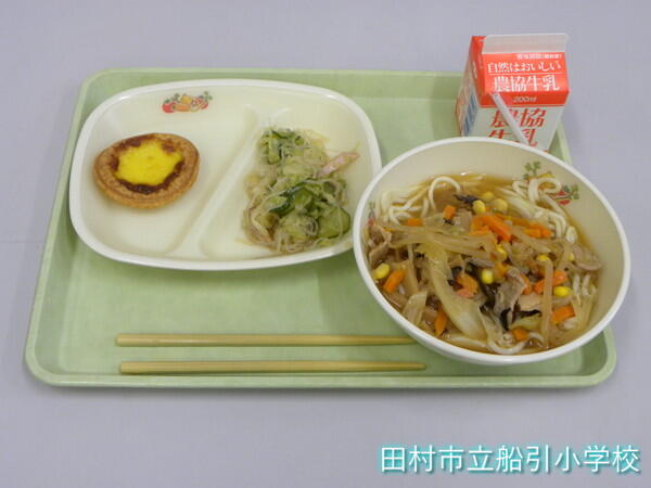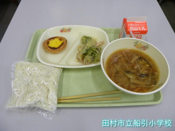 【今日のメニュー】みそラーメン・エッグタルト・中華和え・牛乳