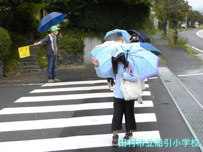 登校する児童とあいさつ運動と兼ねて交通指導をしてくださった役員の方々です。