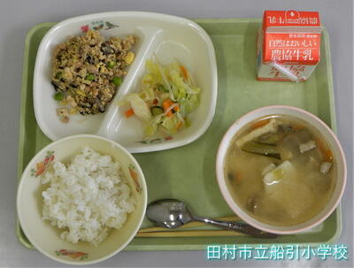 18日(月)ごはん・とりそぼろ・キャベツのしおだれサラダ・すいとん汁・牛乳