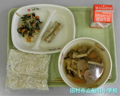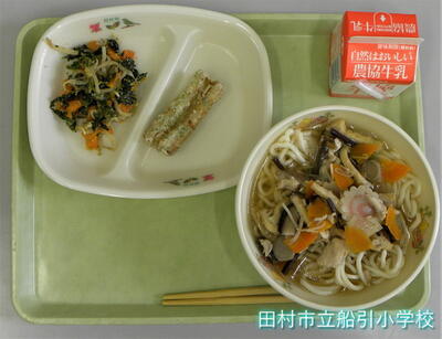 20日(水)ソフトめん・ちくわのいそべあげ・ごまあえ・さんさいうどん汁・牛乳