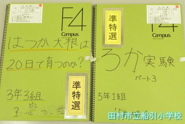 今年度の自由研究93点全て読ませていただきました。その中で特に素晴らしいなと感じたのが、5年生の「ろか実験パート3」と3年生の「はつか大根は20日で育つのか?」の2点です。