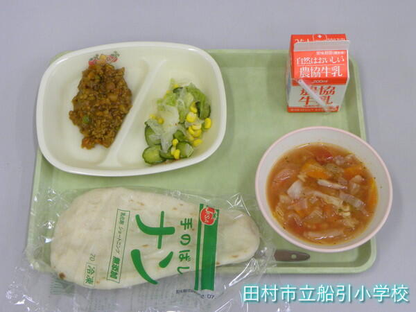 【今日のメニュー】ナン・キーマカレー・コーンサラダ・トマトスープ・牛乳