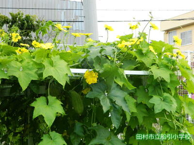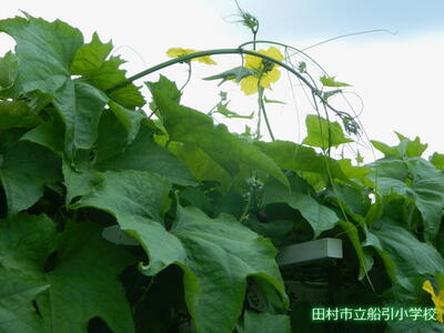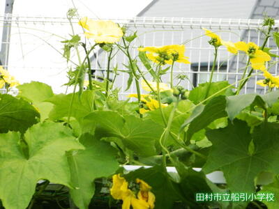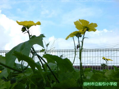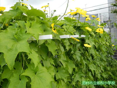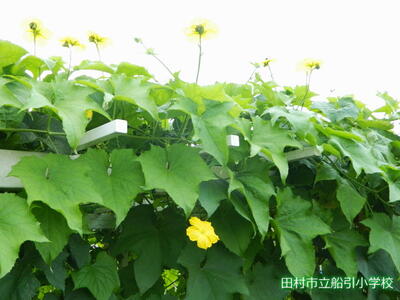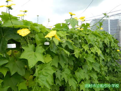 4年生が理科の授業の教材として、育てているヘチマの花がたくさん咲いています。また、受粉に必要な花粉を求めて、昆虫が花の間を飛び回っています。ヘチマは単性花といって、雄花と雌花に分かれて咲きます。
