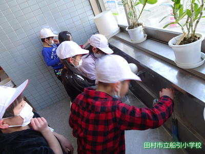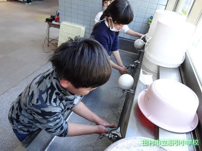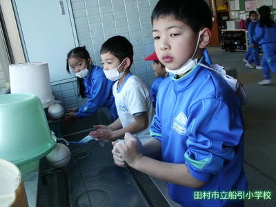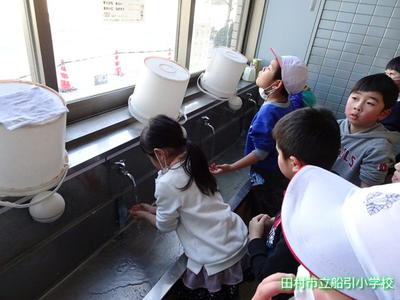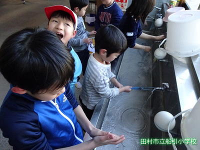 休み時間、思いっきり遊んだ後は、教室に入る前に手洗い・うがいを行います。