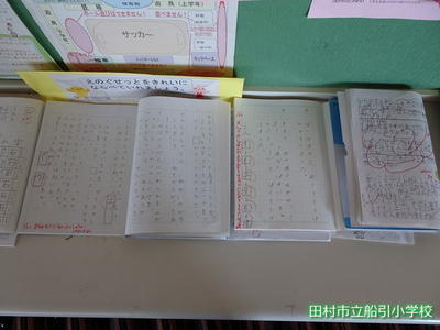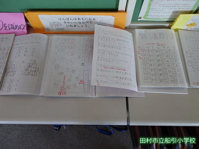 1年2組の廊下にも、自主学習ノートが展示されています。