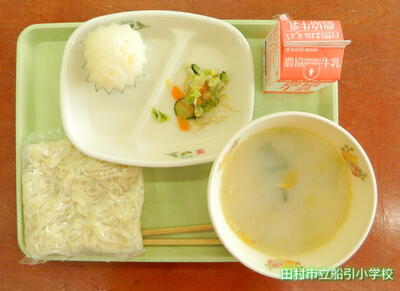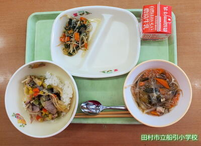 5月13日(月)の給食のメニューご飯・中華丼の具・ナムル・春雨スープ・牛乳