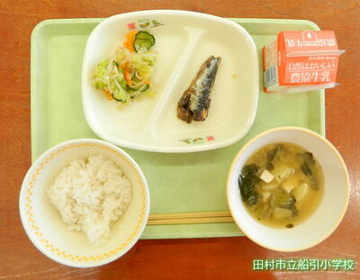 5月14日(火)の給食のメニュー麦ご飯・鰯の生姜煮・和風和え・小松菜の味噌汁・牛乳