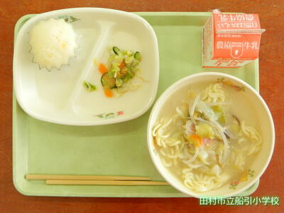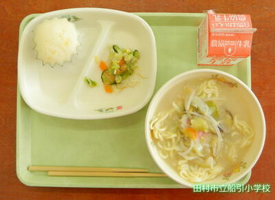 5月15日(水)の給食のメニュー中華麺・鶏白湯麺汁・うま塩サラダ・手作りチーズ蒸しパン・牛乳