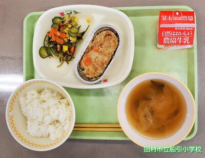5月16日(木)の給食のメニューご飯・手作りハンバーグ・りっちゃんサラダ・玉葱の味噌汁・牛乳