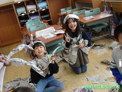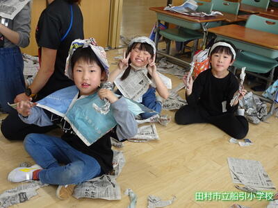 今日は、新聞紙を使って遊びました。帽子を作ったり、洋服を作ったり、武器を作ったり…。どれも個性あふれる素敵な作品でした。