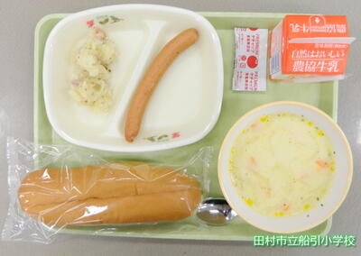 5月17日(金)の給食のメニュー〔食育の日献立〕ドッグパン・ウインナー・トマトケチャップ・ジャーマンポテト・ミルクスープ(減塩メニュー)・牛乳
