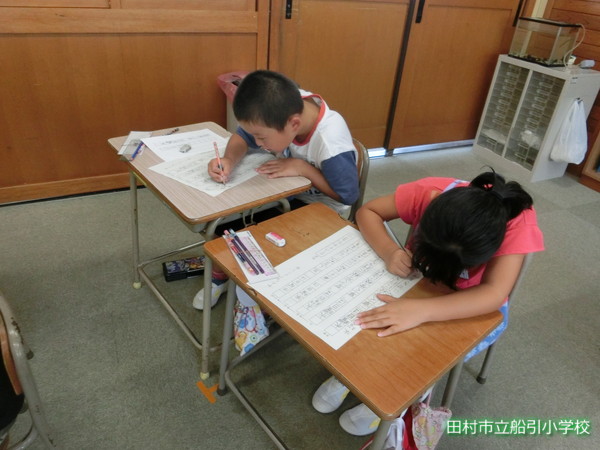 手本をよく見て、一画一画、長さや方向に気を付けて、丁寧に書いています。