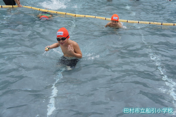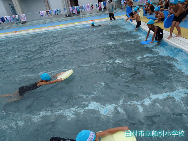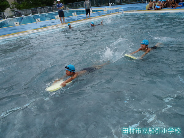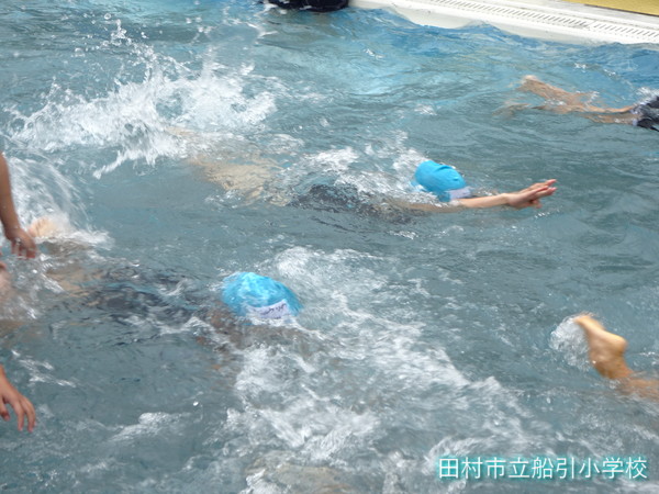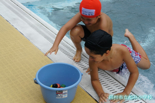 ビート板を使っての泳ぎと自由泳ぎ、クラス対抗のリレーをしました。