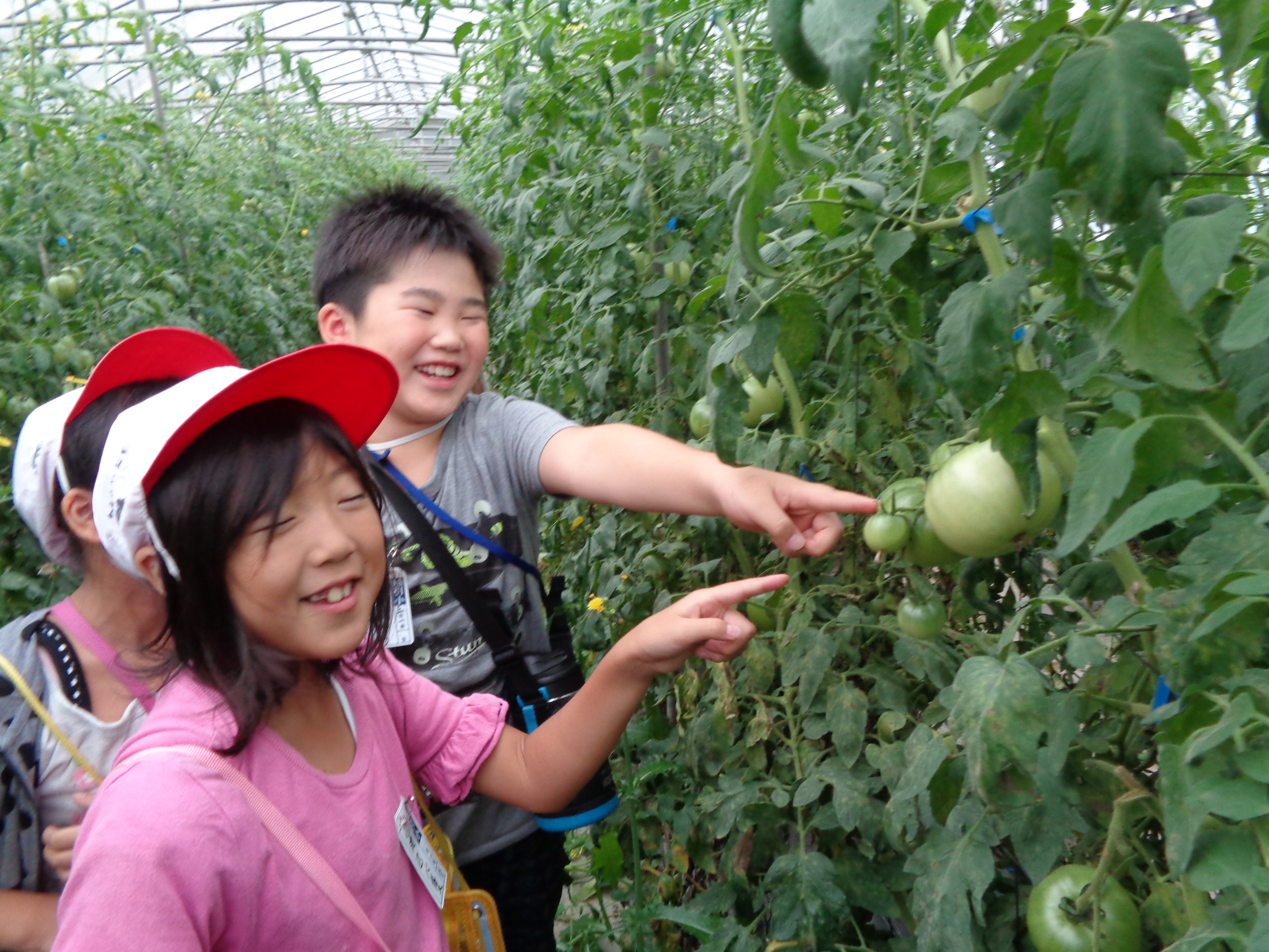 トマトが実っている様子を見て、「ミニトマトと同じで、下から赤くなるんですね。」と、気づく子どもたち。