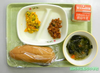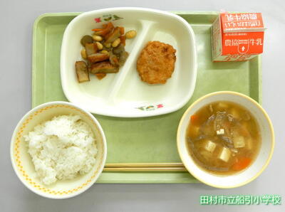 4月22日(月)の給食のメニューご飯・チキン梅カツ・五目豆・豚汁・牛乳