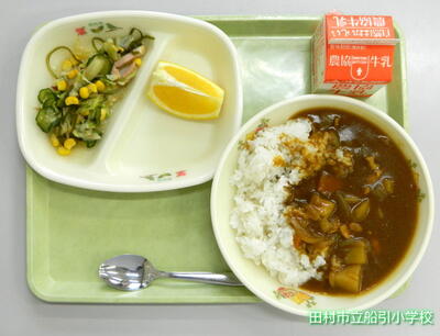 4月23日(火)の給食のメニューチキンカレー・りっちゃんサラダ・河内晩柑・牛乳