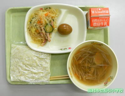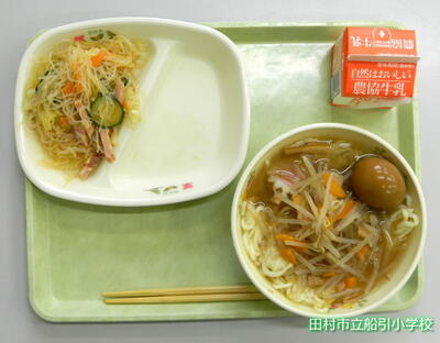 4月24日(水)の給食のメニュー中華麺・もやしラーメンスープ・味付け玉子・中華サラダ・牛乳
