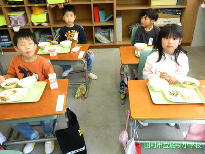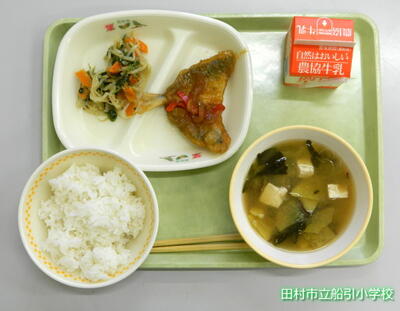 4月25日(木)の給食のメニュー〔Ca&かむ献立〕ご飯・鯵の南蛮漬け・胡麻和え・小松菜の味噌汁・牛乳