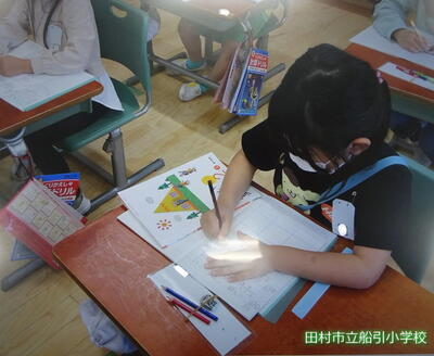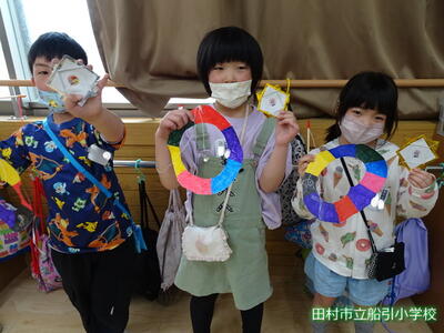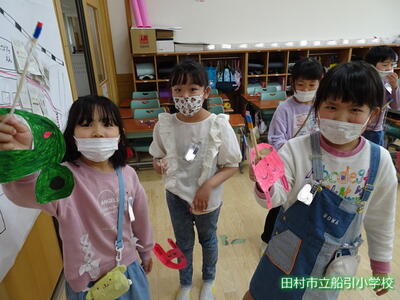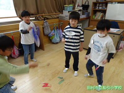図画工作科でけん玉を作りました。普通のけん玉ではなく、厚紙で作るけん玉です。今日は、けん玉が出来上がったので、「紙けん玉大会」です。みんな、とても楽しそう。