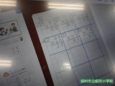 これから、繰り上がりのある筆算を学習していきます。位をそろえることや一の位から計算すること等、約束を確かめながら計算練習を進めていきたいと思います。