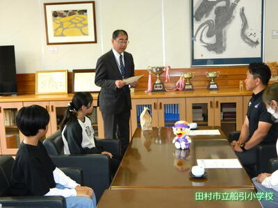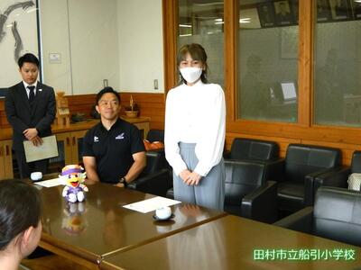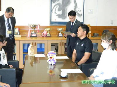 5月1日(水)に福島スポーツエンタテインメント株式会社(福島ファイヤーボンズ)代表取締役社長の西田様と協賛企業「喫茶DANROオーナー」勝山様にご来校いただき、校長室で「バスケットボール寄贈式」が行われました。子ども達のためにと、15個のバスケットボールを寄贈していただきました。
