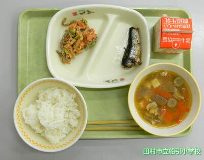 2月13日(火)の給食のメニューご飯・鰯の生姜煮・こんにゃくサラダ・豚汁・牛乳