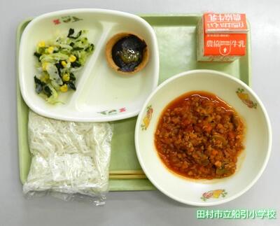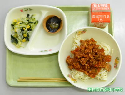 2月14日(水)の給食のメニュー〔バレンタイン献立〕スパゲッティ麺・スパゲッティミートソース・ほうれん草サラダ・手作りチョコタルト・牛乳