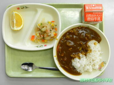 2月15日(木)の給食のメニューチキンカレー・水菜サラダ・はるか(柑橘)・牛乳