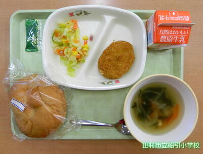 2月16日(金)の給食のメニューバンズパン・野菜コロッケ・パックソース・コーンサラダ・オニオンスープ・牛乳