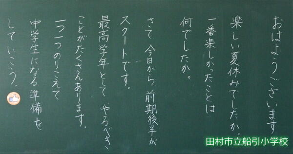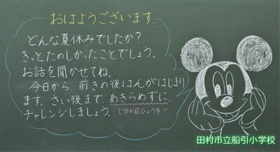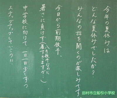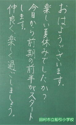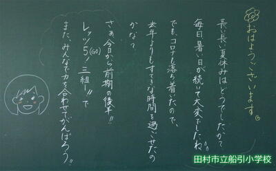 夏休みが終わり、子ども達の元気な声が学校に戻ってきました。今日から転入生が一人加わり、636人でリスタートです。文化の秋・スポーツの秋に向けて、また、子ども達と一緒に頑張っていきます。