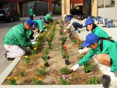 今回、花の苗300本がロータリークラブから寄贈され、その一本一本を大切に植えました。