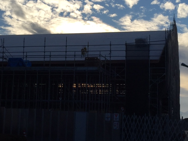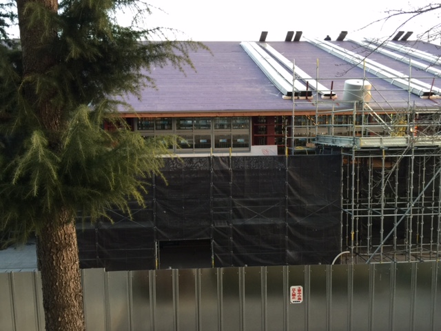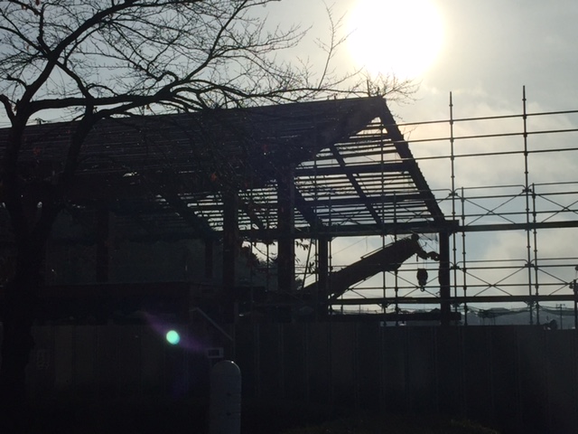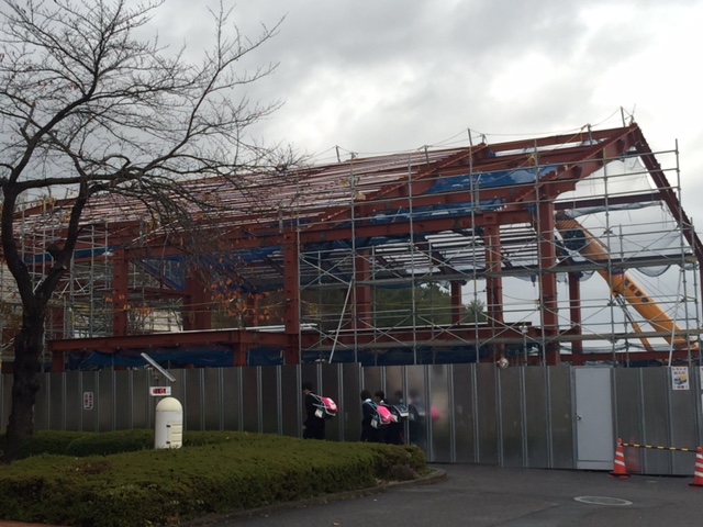 寒い中、新体育館の建設工事が着々と進んでいます。工事関係者の皆様、ご苦労様です。