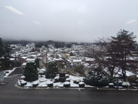 (職員室からの町内。片曽根山も雪雲で隠れています)