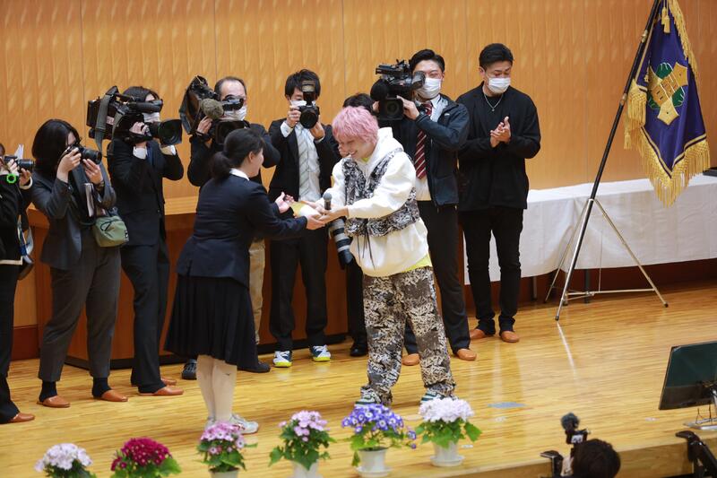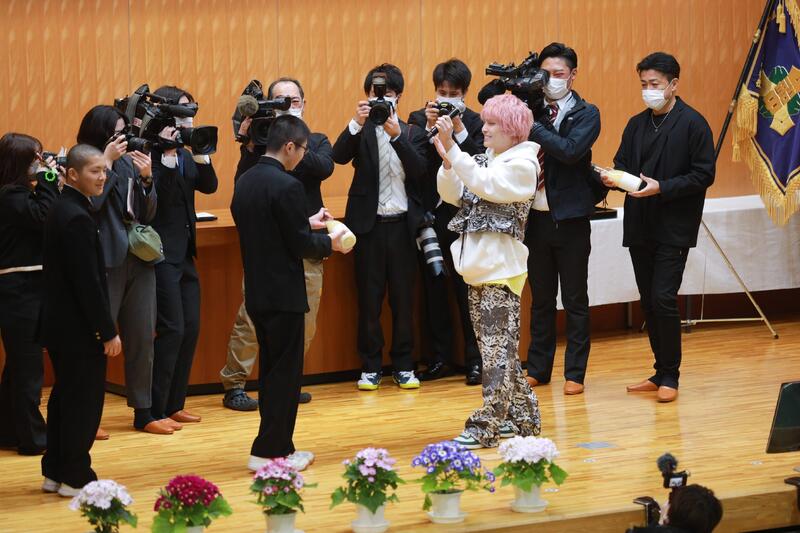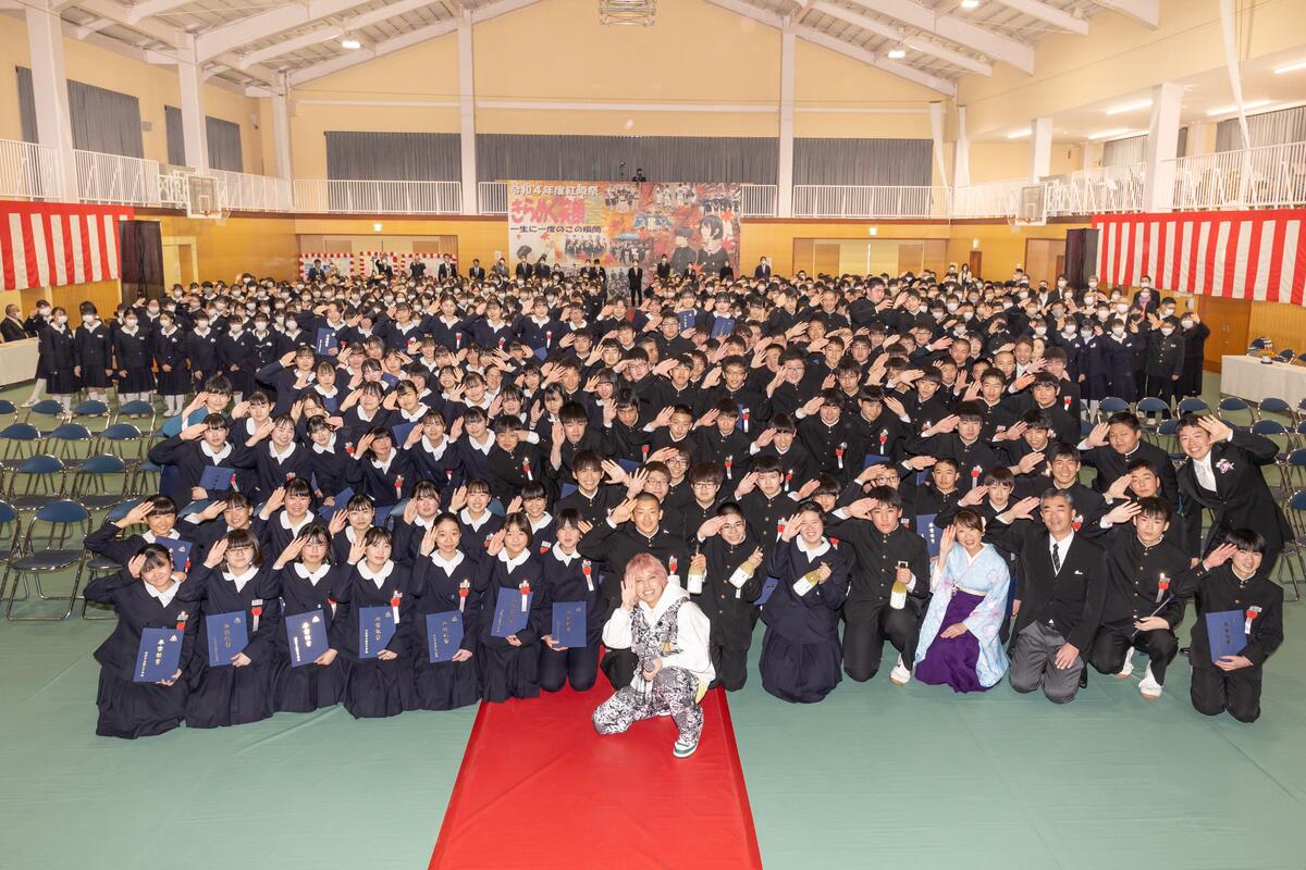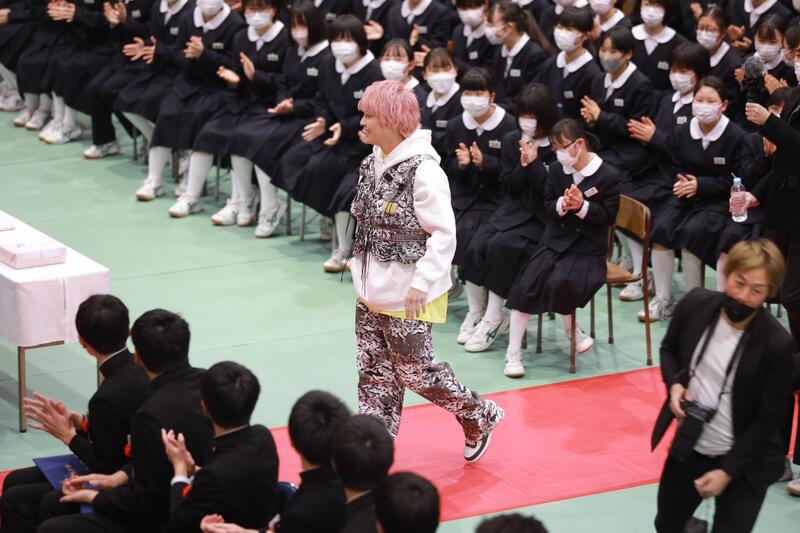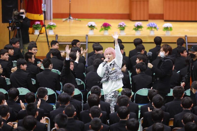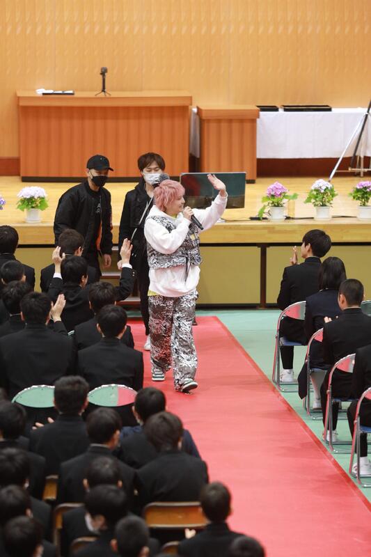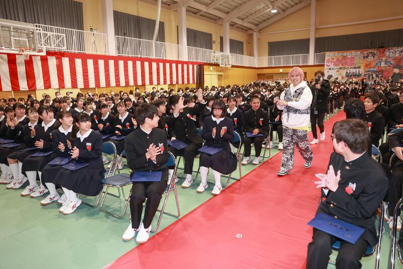 校長先生が体育館中央で「今日みなさんの卒業のお祝いに駆けつけてくださった方がいらっしゃいます。手越祐也さんです。どうぞ。」の紹介で、後方扉からアーティストの手越祐也さんが入場しました。