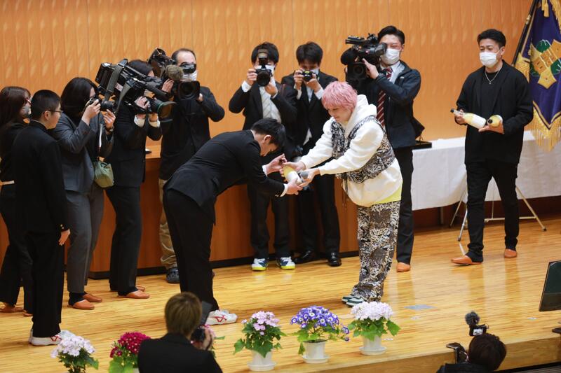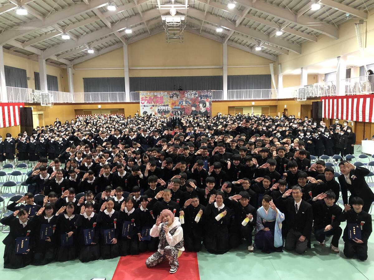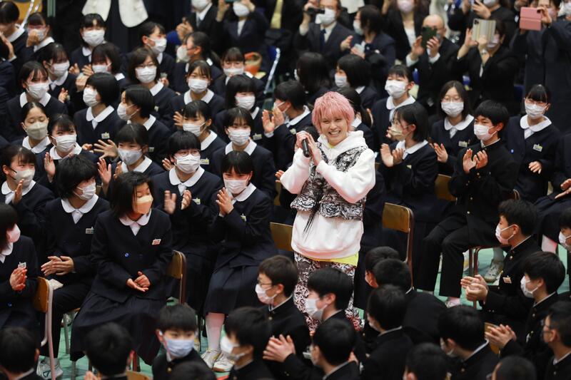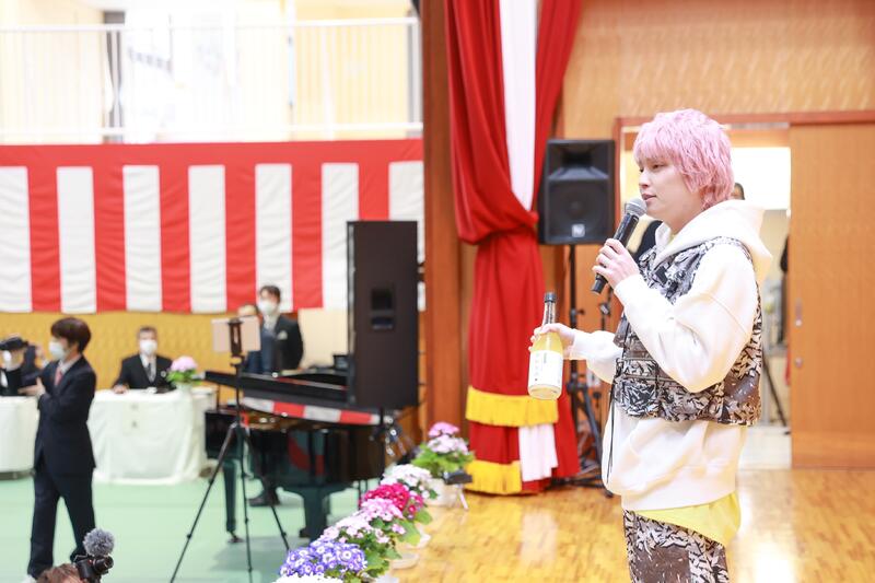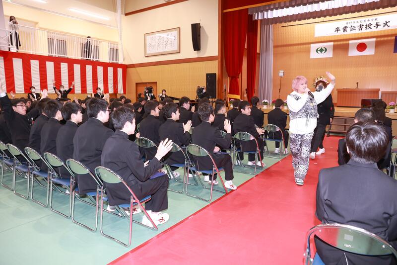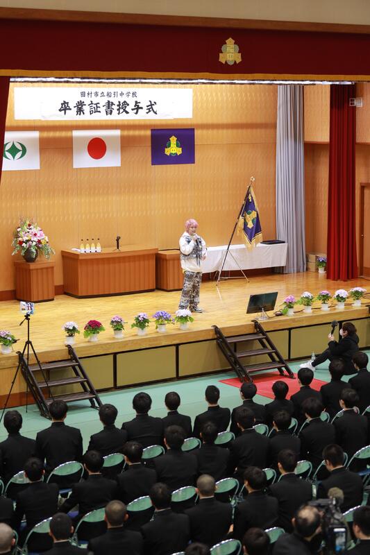 校長先生が体育館中央で「今日みなさんの卒業のお祝いに駆けつけてくださった方がいらっしゃいます。手越祐也さんです。どうぞ。」の紹介で、後方扉からアーティストの手越祐也さんが入場しました。